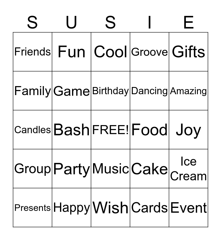 This bingo card has a free space and 24 words: Party, Happy, Birthday, Presents, Gifts, Friends, Family, Fun, Food, Music, Dancing, Candles, Cake, Ice Cream, Game, Cards, Joy, Cool, Amazing, Bash, Event, Group, Groove and Wish.