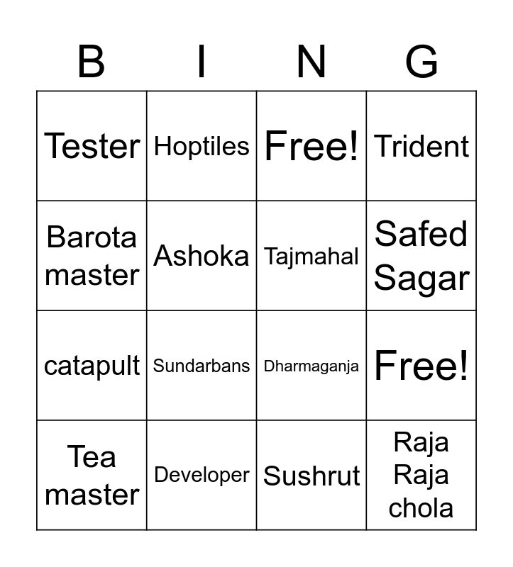 This bingo card has 20 words: Free!, Free!, Free!, cosmonaut, Tea master, Barota master, Developer, Tester, catapult, Hoptiles, Sundarbans, Dharmaganja, Ashoka, Raja Raja chola, Tajmahal, Trinity, Safed Sagar, Trident, Sushrut and Kanad.