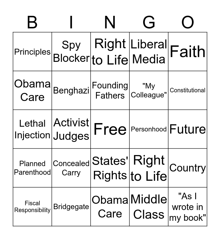 This bingo card has a free space and 24 words: Concealed Carry, Bridgegate, Founding Fathers, Fiscal Responsibility, Faith, Principles, Obama Care, Spy Blocker, Personhood, States' Rights, "My Colleague", Lethal Injection, Right to Life, Country, Benghazi, Middle Class, Future, Right to Life, Constitutional, Activist Judges, "As I wrote in my book", Planned Parenthood, Liberal Media and Obama Care.