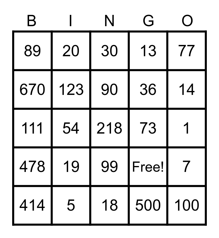 This bingo card has 25 words: 19, 18, 90, 414, 77, 89, 670, 20, 73, 99, 36, 111, Free!, 7, 123, 100, 1, 30, 14, 54, 218, 5, 478, 13 and 500.