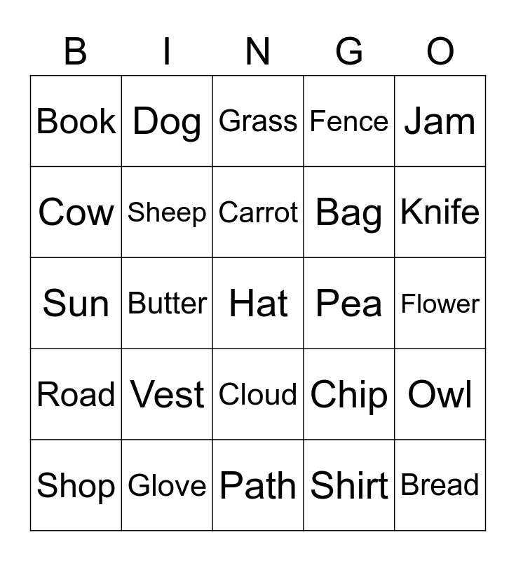 This bingo card has 53 words: Free!, Hat, Sock, Shirt, Vest, Pin, Dog, Duck, Cow, Horse, Sheep, Ball, Owl, Chip, Fish, Shop, Carrot, Pea, Bean, Jam, Butter, Bread, Bag, Book, Coat, Glove, Mug, Pen, Game, Knife, Spoon, Fork, Plate, Chair, Table, Shelf, Fence, Path, Grass, Shed, Bench, Plant, Flower, Tree, Light, Cloud, Sky, Moon, Sun, Road, Street, Lane and Drive.