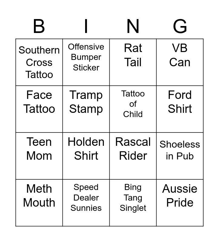 This bingo card has 16 words: Speed Dealer Sunnies, Shoeless in Pub, Rat Tail, Southern Cross Tattoo, Teen Mom, Offensive Bumper Sticker, Rascal Rider, Bing Tang Singlet, Face Tattoo, Tramp Stamp, Meth Mouth, VB Can, Holden Shirt, Ford Shirt, Tattoo of Child and Aussie Pride.