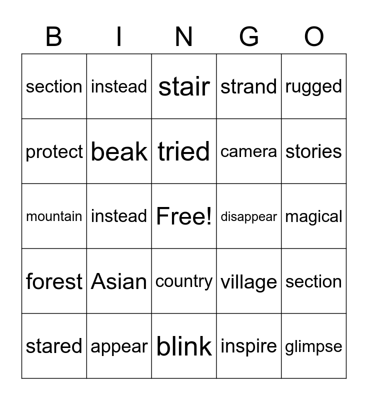 This bingo card has a free space and 29 words: stared, tried, instead, expected, section, stair, beak, Asian, disappear, appear, magical, glimpse, blink, inspire, stories, possible, country, forest, rugged, mountain, village, science, camera, protect, strand, instead, section, tried and stared.