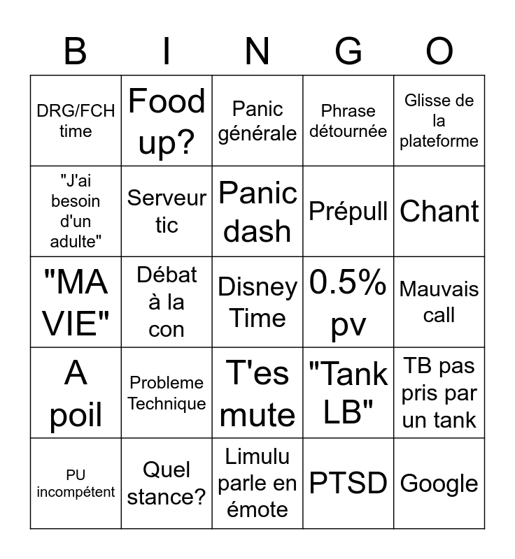 This bingo card has a free space and 24 words: Probleme Technique, Quel stance?, Panic dash, PU incompétent, Glisse de la plateforme, DRG/FCH time, "J'ai besoin d'un adulte", Food up?, 0.5% pv, T'es mute, Prépull, "MA VIE", "Tank LB", TB pas pris par un tank, Serveur tic, PTSD, Mauvais call, Panic générale, Chant, Débat à la con, Google, A poil, Phrase détournée and Limulu parle en émote.