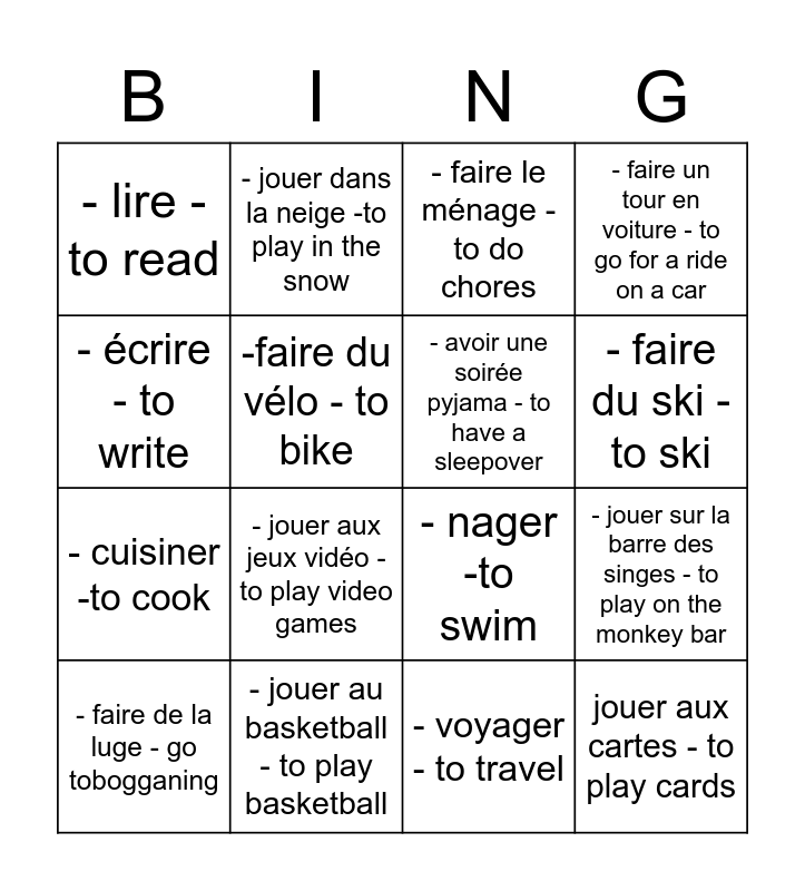 This bingo card has 23 words: jouer aux cartes - to play cards, -jouer aux jeux de société - to play board games, - faire du ski - to ski, - dessiner - to draw, - écrire - to write, - lire - to read, -faire du vélo - to bike, - jouer dans la neige -to play in the snow, - faire de la luge - go tobogganing, - regarder la télé - to watch TV, - jouer aux jeux vidéo - to play video games, - cuisiner -to cook, -jouer de la musique-to play music, - écouter de la musique - to listen to music, - jouer au basketball - to play basketball, - jouer au terrain de jeux- to play on the playground, - faire le ménage - to do chores, - nager -to swim, - avoir une soirée pyjama - to have a sleepover, - jouer sur la barre des singes - to play on the monkey bar, - faire un tour en voiture - to go for a ride on a car, - voyager - to travel and - manger ensemble -to eat together.