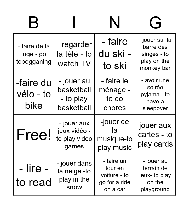 This bingo card has 20 words: jouer aux cartes - to play cards, -jouer aux jeux de société - to play board games, - faire du ski - to ski, - dessiner - to draw, - lire - to read, -faire du vélo - to bike, - jouer dans la neige -to play in the snow, - faire de la luge - go tobogganing, Free!, - regarder la télé - to watch TV, - jouer aux jeux vidéo - to play video games, -jouer de la musique-to play music, - jouer au basketball - to play basketball, - jouer au terrain de jeux- to play on the playground, - faire le ménage - to do chores, - nager -to swim, - avoir une soirée pyjama - to have a sleepover, - jouer sur la barre des singes - to play on the monkey bar, - faire un tour en voiture - to go for a ride on a car and - manger ensemble -to eat together.