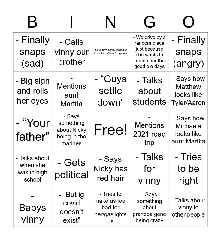 This bingo card has a free space and 24 words: - Gets political, - “But ig covid doesn’t exist”, - “Guys settle down”, - Babys vinny, - Finally snaps (angry), - Finally snaps (sad), - Big sigh and rolls her eyes, - Calls vinny our brother, - Mentions 2021 road trip, - Says Nicky has red hair, - Talks about students, - “Your father”, - Talks for vinny, - Tries to be right, - Mentions aunt Martita, - Says something about grandpa gene being crazy, - Says how Michaela looks like aunt Martita, - Says how Nicky looks like John/Aaron/Tyler/Eugene’s, - Says how Matthew looks like Tyler/Aaron, - Says something about Nicky being in the marines, - Talks about vinny to other people, - Talks about when she was in high school, - We drive by a random place just because she wants to remember the good ole days and - Tries to make us feel bad for her/gaslights us.