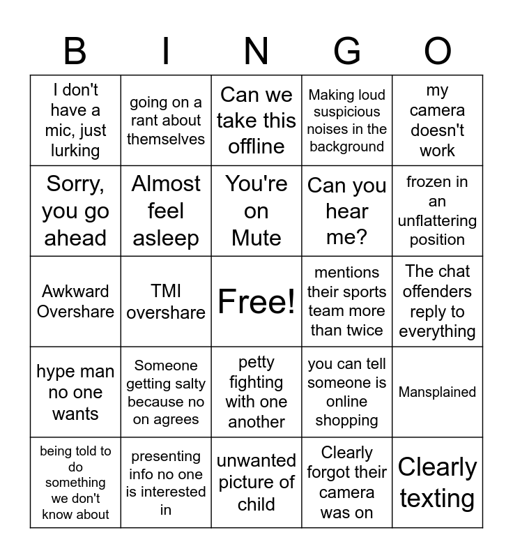 This bingo card has a free space and 24 words: Someone getting salty because no on agrees, presenting info no one is interested in, You're on Mute, being told to do something we don't know about, my camera doesn't work, I don't have a mic, just lurking, Sorry, you go ahead, going on a rant about themselves, mentions their sports team more than twice, petty fighting with one another, Can you hear me?, Awkward Overshare, you can tell someone is online shopping, Mansplained, Almost feel asleep, Clearly forgot their camera was on, The chat offenders reply to everything, Can we take this offline, frozen in an unflattering position, TMI overshare, Clearly texting, hype man no one wants, Making loud suspicious noises in the background and unwanted picture of child.