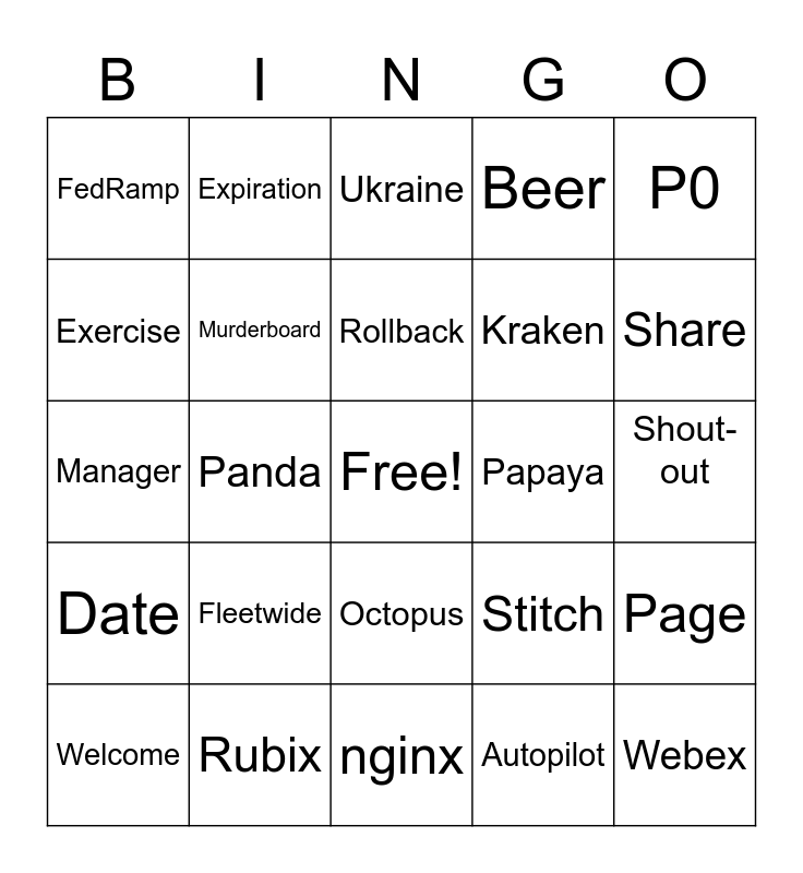 This bingo card has a free space and 24 words: Fleetwide, Rubix, Rollback, Welcome, P0, FedRamp, Exercise, Expiration, Papaya, Octopus, Kraken, Manager, Stitch, Page, Murderboard, Autopilot, Shout-out, Ukraine, Share, Panda, Webex, Date, Beer and nginx.