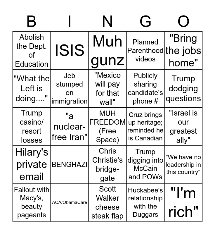 This bingo card has a free space and 24 words: BENGHAZI, ACA/ObamaCare, "Mexico will pay for that wall", Fallout with Macy's, beauty pageants, "Bring the jobs home", Abolish the Dept. of Education, "What the Left is doing....", ISIS, Cruz brings up heritage; reminded he is Canadian, Chris Christie's bridge-gate, Publicly sharing candidate's phone #, Trump casino/ resort losses, Trump digging into McCain and POWs, "We have no leadership in this country", Jeb stumped on immigration, Huckabee's relationship with the Duggars, "Israel is our greatest ally", Muh gunz, Trump dodging questions, "a nuclear-free Iran", "I'm rich", Hilary's private email, Planned Parenthood videos and Scott Walker cheese steak flap.