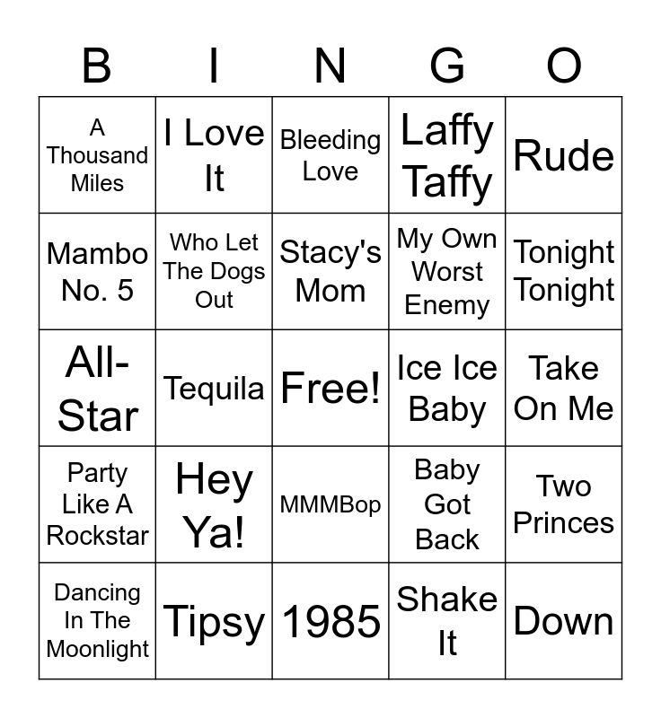 This bingo card has a free space and 26 words: MMMBop, Shake It, Stacy's Mom, Tipsy, Rude, A Thousand Miles, Mambo No. 5, I Love It, Take On Me, Baby Got Back, My Own Worst Enemy, All-Star, Two Princes, Dancing In The Moonlight, Tequila, Flavor of The Weak, Laffy Taffy, Party Like A Rockstar, Bleeding Love, Down, Tonight Tonight, 1985, Ice Ice Baby, Hey Ya!, Who Let The Dogs Out and I Want Candy.