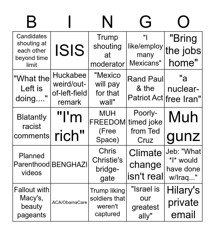 This bingo card has a free space and 24 words: BENGHAZI, ACA/ObamaCare, "Mexico will pay for that wall", Fallout with Macy's, beauty pageants, "Bring the jobs home", Candidates shouting at each other beyond time limit, "What the Left is doing....", ISIS, Poorly-timed joke from Ted Cruz, Chris Christie's bridge-gate, Rand Paul & the Patriot Act, Blatantly racist comments, Climate change isn't real, Jeb: "What *I* would have done w/Iraq...", Huckabee weird/out-of-left-field remark, "Israel is our greatest ally", Muh gunz, Trump shouting at moderator, "a nuclear-free Iran", "I'm rich", Hilary's private email, Planned Parenthood videos, "I like/employ many Mexicans" and Trump liking soldiers that weren't captured.