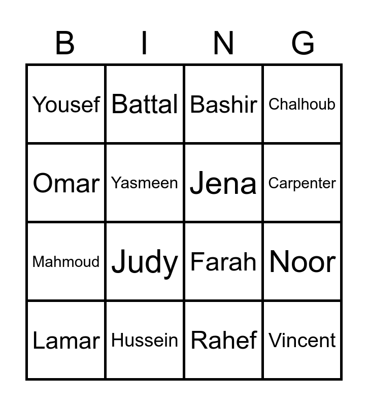 This bingo card has 19 words: Farah, Alya, Bashir, Vincent, Noor, Omar, Rahef, Yousef, Battal, Mahmoud, Judy, Yasmeen, Jena, Hussein, Lamar, Ariana, Chalhoub, Carpenter and Stortini.