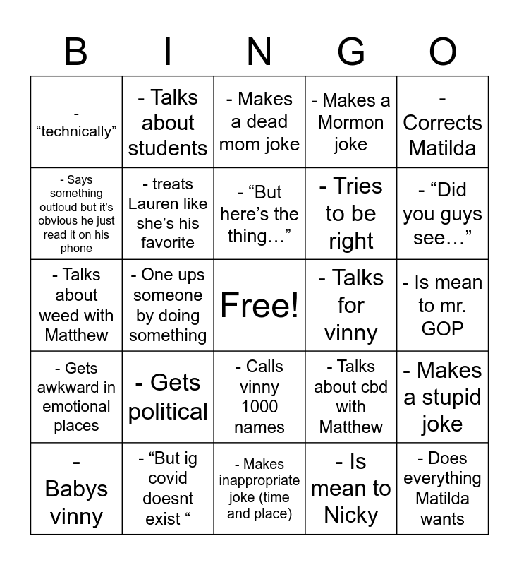 This bingo card has a free space and 24 words: - Gets political, - “But ig covid doesnt exist “, - “But here’s the thing…”, - Babys vinny, - Corrects Matilda, - “technically”, - Says something outloud but it’s obvious he just read it on his phone, - Talks about students, - Talks for vinny, - Calls vinny 1000 names, - Tries to be right, - Talks about weed with Matthew, - Talks about cbd with Matthew, - Makes a stupid joke, - treats Lauren like she’s his favorite, - Is mean to Nicky, - Is mean to mr. GOP, - Makes a dead mom joke, - “Did you guys see…”, - One ups someone by doing something, - Does everything Matilda wants, - Gets awkward in emotional places, - Makes a Mormon joke and - Makes inappropriate joke (time and place).