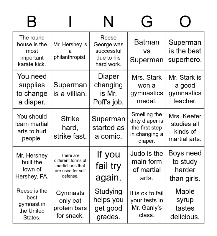 This bingo card has a free space and 24 words: There are different forms of martial arts that are used for self defense., Gymnasts only eat protein bars for snack., Diaper changing is Mr. Poff's job., Reese is the best gymnast in the United States., Superman is the best superhero., The round house is the most important karate kick., You need supplies to change a diaper., Mr. Hershey is a philanthropist., Smelling the dirty diaper is the first step in changing a diaper., If you fail try again., Mrs. Stark won a gymnastics medal., You should learn martial arts to hurt people., Judo is the main form of martial arts., Boys need to study harder than girls., Superman is a villian., It is ok to fail your tests in Mr. Ganly's class., Mrs. Keefer studies all kinds of martial arts., Reese George was successful due to his hard work., Mr. Stark is a good gymnastics teacher., Strike hard, strike fast., Maple syrup tastes delicious., Mr. Hershey built the town of Hershey, PA., Batman vs Superman and Studying helps you get good grades..