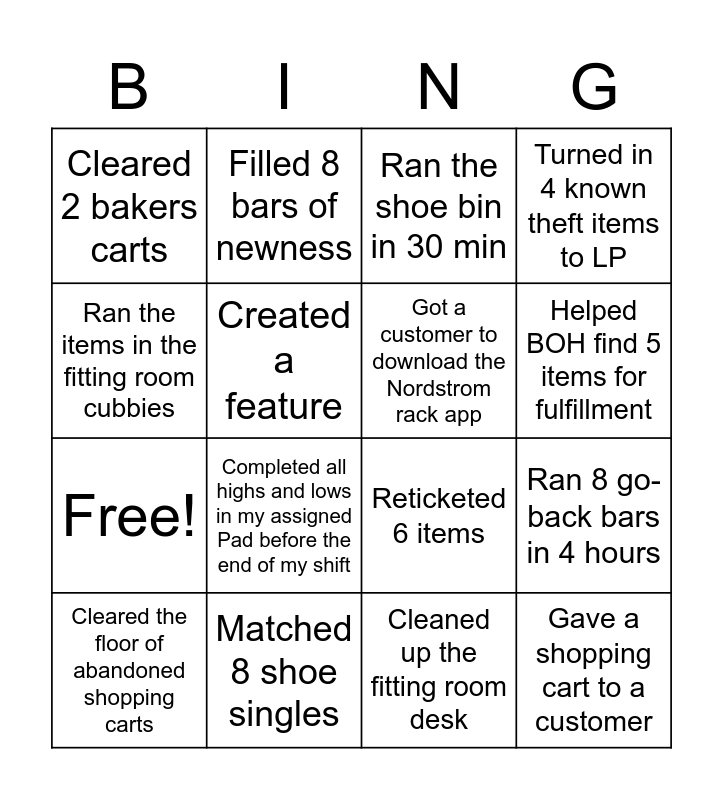 This bingo card has 20 words: Ran 8 go-back bars in 4 hours, Sold an item out of the case, Ran the shoe bin in 30 min, sorted or Ran the bay bar, Cleared the floor of abandoned shopping carts, Ran the items in the fitting room cubbies, Matched 8 shoe singles, Cleared 2 bakers carts, Free!, Filled 8 bars of newness, Completed all highs and lows in my assigned Pad before the end of my shift, Reticketed 6 items, Created a feature, Gave a shopping cart to a customer, Got a customer to download the Nordstrom rack app, Assisted a team member with a task, Helped BOH find 5 items for fulfillment, Turned in 4 known theft items to LP, Cleaned up the fitting room desk and Ran 770 and 808 items to BOH.