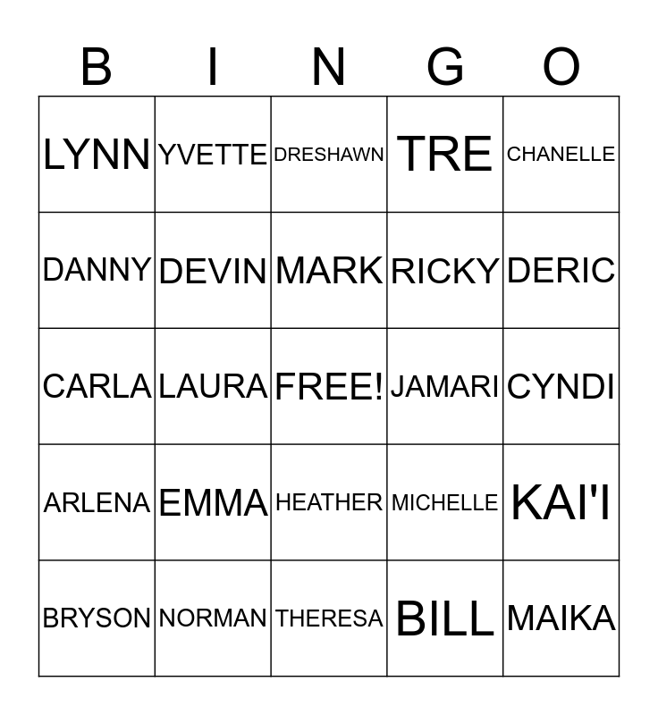 This bingo card has a free space and 24 words: EMMA, NORMAN, MARK, BRYSON, CHANELLE, LYNN, DANNY, YVETTE, JAMARI, HEATHER, RICKY, CARLA, MICHELLE, KAI'I, DEVIN, BILL, CYNDI, DRESHAWN, DERIC, LAURA, MAIKA, ARLENA, TRE and THERESA.