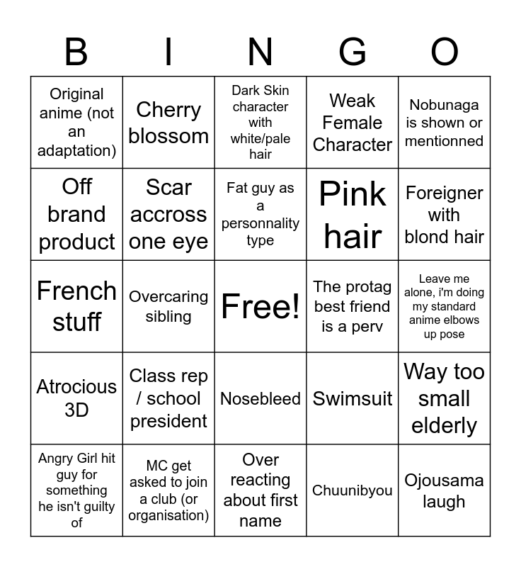This bingo card has a free space and 24 words: Class rep / school president, MC get asked to join a club (or organisation), Fat guy as a personnality type, Angry Girl hit guy for something he isn't guilty of, Nobunaga is shown or mentionned, Original anime (not an adaptation), Off brand product, Cherry blossom, The protag best friend is a perv, Nosebleed, Pink hair, French stuff, Swimsuit, Way too small elderly, Scar accross one eye, Chuunibyou, Leave me alone, i'm doing my standard anime elbows up pose, Dark Skin character with white/pale hair, Foreigner with blond hair, Overcaring sibling, Ojousama laugh, Atrocious 3D, Weak Female Character and Over reacting about first name.