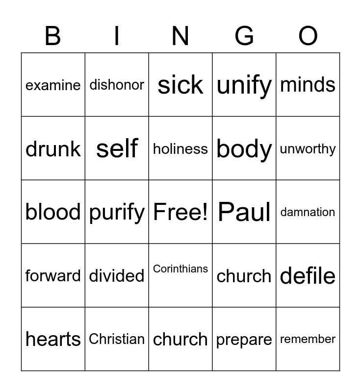 This bingo card has a free space and 24 words: divided, Christian, holiness, hearts, minds, examine, drunk, dishonor, Paul, Corinthians, body, blood, church, defile, self, prepare, damnation, sick, unworthy, purify, remember, forward, unify and church.