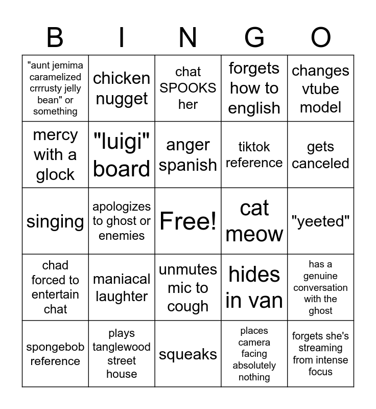 This bingo card has a free space and 24 words: maniacal laughter, plays tanglewood street house, anger spanish, spongebob reference, changes vtube model, "aunt jemima caramelized crrrusty jelly bean" or something, mercy with a glock, chicken nugget, cat meow, unmutes mic to cough, tiktok reference, singing, hides in van, has a genuine conversation with the ghost, "luigi" board, places camera facing absolutely nothing, "yeeted", chat SPOOKS her, gets canceled, apologizes to ghost or enemies, forgets she's streaming from intense focus, chad forced to entertain chat, forgets how to english and squeaks.