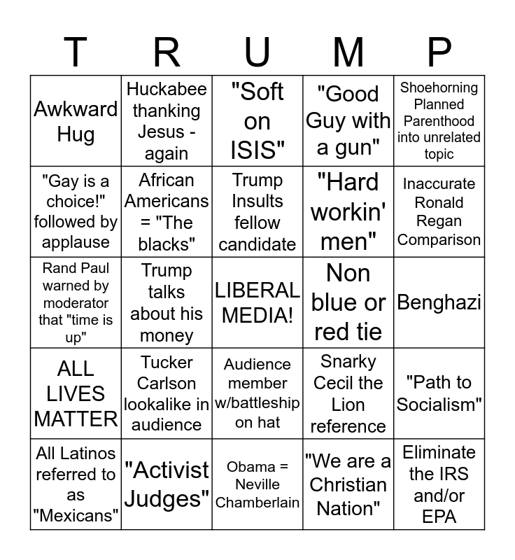 This bingo card has a free space and 24 words: Tucker Carlson lookalike in audience, "Activist Judges", Trump Insults fellow candidate, All Latinos referred to as "Mexicans", Shoehorning Planned Parenthood into unrelated topic, Awkward Hug, "Gay is a choice!" followed by applause, Huckabee thanking Jesus - again, Non blue or red tie, Audience member w/battleship on hat, "Hard workin' men", Rand Paul warned by moderator that "time is up", Snarky Cecil the Lion reference, "Path to Socialism", African Americans = "The blacks", "We are a Christian Nation", Benghazi, "Soft on ISIS", Inaccurate Ronald Regan Comparison, Trump talks about his money, Eliminate the IRS and/or EPA, ALL LIVES MATTER, "Good Guy with a gun" and Obama = Neville Chamberlain.