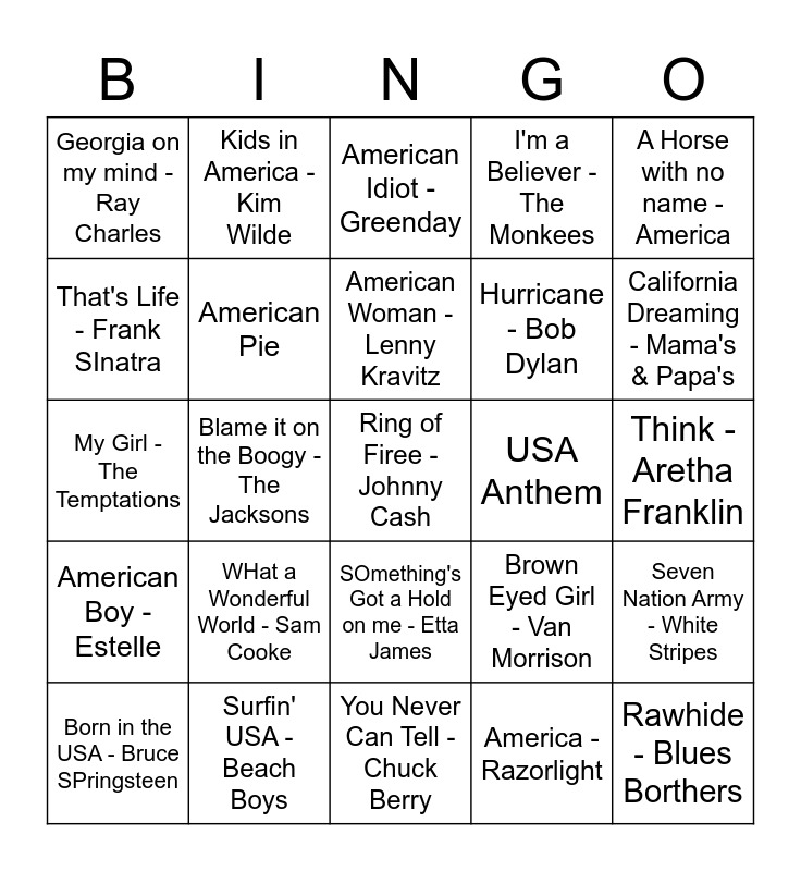 This bingo card has a free space and 34 words: Breakfast in America - Supertramp, America - Razorlight, Cheers Theme - Gary Portnoy, MASH, American Boy - Estelle, American Pie, A Horse with no name - America, Born in the USA - Bruce SPringsteen, Kids in America - Kim Wilde, Amerika - Rammstein, American Woman - Lenny Kravitz, American Idiot - Greenday, Devil in desiguise - Elvis, 9 to 5 - Dolly Parton, USA Anthem, California Dreaming - Mama's & Papa's, Surfin' USA - Beach Boys, My Girl - The Temptations, WHat a Wonderful World - Sam Cooke, Brown Eyed Girl - Van Morrison, SOmething's Got a Hold on me - Etta James, Papa's got a brand new bag - James, Georgia on my mind - Ray Charles, Think - Aretha Franklin, You Never Can Tell - Chuck Berry, Rawhide - Blues Borthers, I'm a Believer - The Monkees, Cecilia - Simon & Garfunkel, Hurricane - Bob Dylan, That's Life - Frank SInatra, So What - Miles Davis, Blame it on the Boogy - The Jacksons, Seven Nation Army - White Stripes and I'm Every Woman - Chaka Kahn.