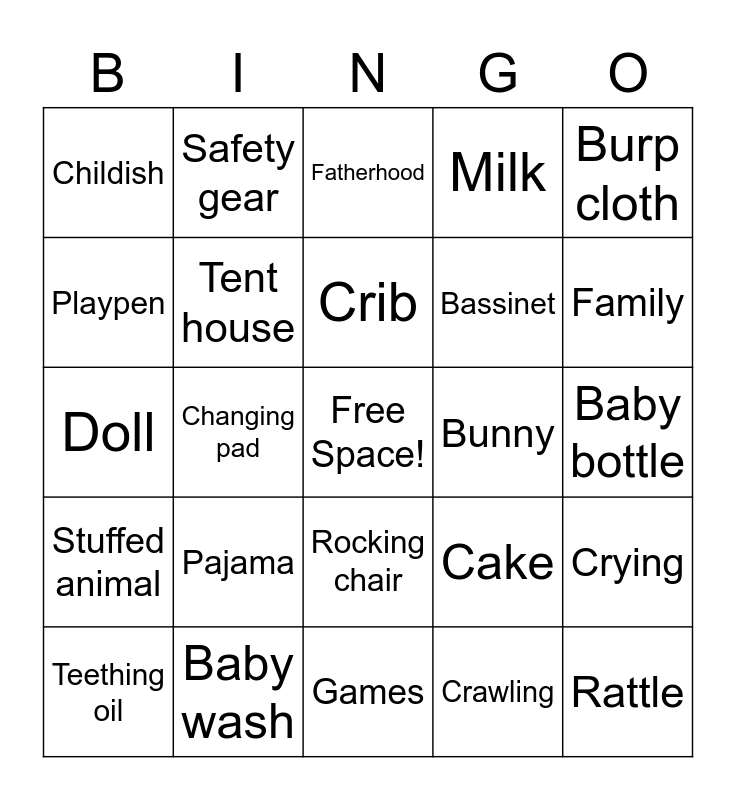 This bingo card has a free space and 100 words: Baby, Baby book, Baby bottle, Baby food, Baby gate, Baby hangers, Baby monitor, Baby oil, Baby powder, Baby shampoo, Baby sitter, Baby spoon, Baby socks, Baby wash, Baby wipes, Balloons, Bassinet, Bath toys, Bib, Blanket, Booties, Bottle brush, Bottle holder, Bottle warmer, Bouncer, Bunny, Burp cloth, Cake, Car seat, Celebration, Changing pad, Childish, Child proof, Cradle, Crawling, Crib, Crying, Daycare, Diaper, Diaper bag, Diaper cream, Diaper genie, Doll, Dream, Family, Fatherhood, Feeding, Formula, Fun, Games, Gifts, Gripe water, High chair, Hospital bag, Infant, Love, Lullaby, Maternity leave, Memory, Milk, Miracle, Motherhood, Musical toy, Nap time, Newborn, Nursing pillow, Nursery rhyme, Onesie, Outlet covers, Pacifier, Paediatrician, Pajama, Parents, Party, Paternity leave, Photo album, Piggy bank, Playpen, Play mat, Plush toy, Pregnant, Rattle, Receiving blanket, Rocking chair, Rubber duck, Safety gear, Sleep, Story book, Stroller, Stuffed animal, Swing, Teddy bear, Teething, Teething oil, Tent house, Thermometer, Toy, Toy box, Ultrasound and Wash cloth.