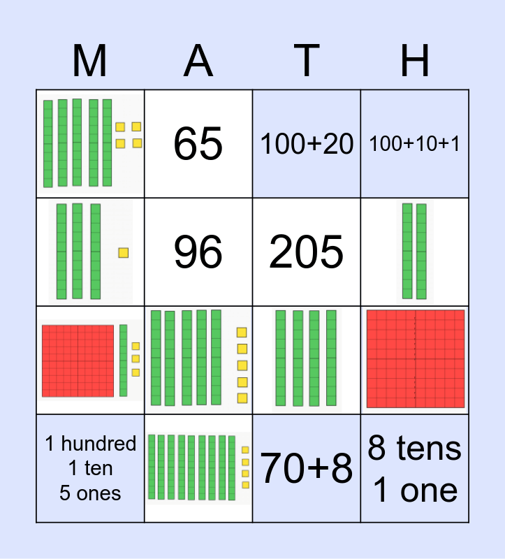 This bingo card has 10 images and 15 words: 362, 475, 96, 65, FREE, 789, 15, 205, 70+8, 100+20, ? ? ? ? ? ? ? ? ? ? ? ? ? ?, 1 hundred 1 ten 5 ones, 8 tens 1 one, 100+10+1 and 5 tens 9 ones.