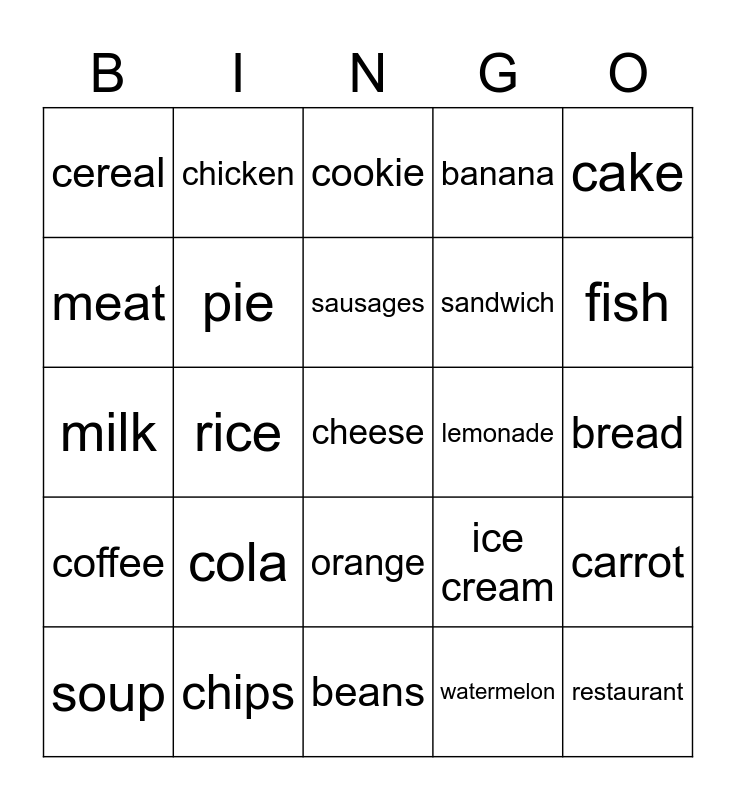 This bingo card has 25 words: coffee, chips, cheese, watermelon, cake, cereal, chicken, cookie, lemonade, carrot, meat, pie, beans, ice cream, fish, soup, rice, sausages, sandwich, bread, milk, cola, orange, banana and restaurant.