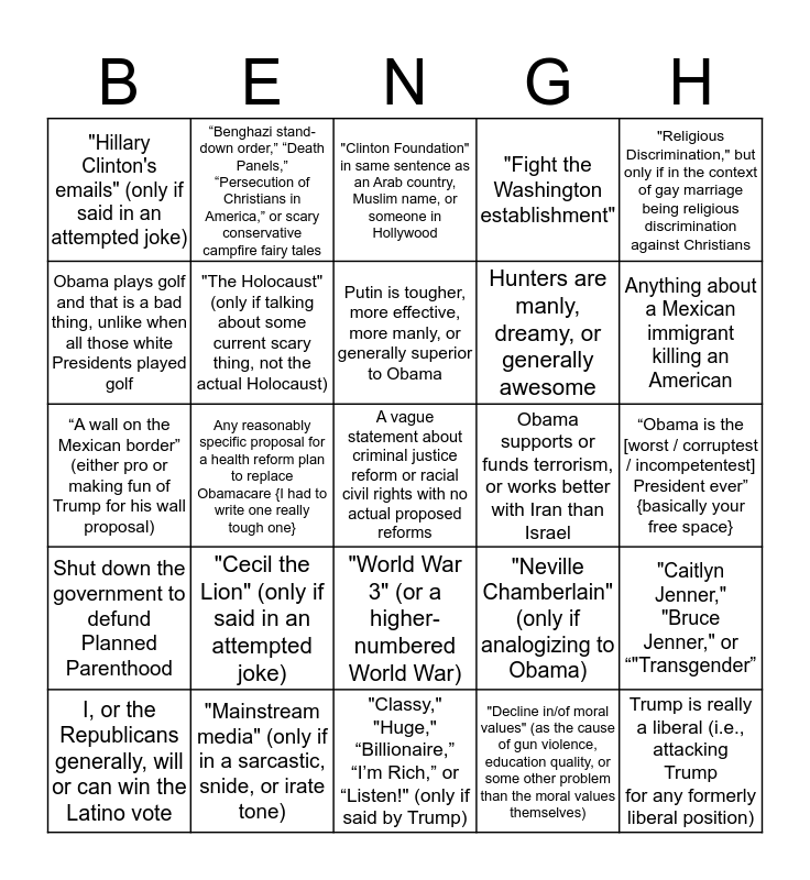 This bingo card has 25 words: "Cecil the Lion" (only if said in an attempted joke), "Classy," "Huge," “Billionaire,” “I’m Rich,” or “Listen!" (only if said by Trump), Putin is tougher, more effective, more manly, or generally superior to Obama, I, or the Republicans generally, will or can win the Latino vote, "Religious Discrimination," but only if in the context of gay marriage being religious discrimination against Christians, "Hillary Clinton's emails" (only if said in an attempted joke), Obama plays golf and that is a bad thing, unlike when all those white Presidents played golf, “Benghazi stand-down order,” “Death Panels,” “Persecution of Christians in America,” or scary conservative campfire fairy tales, Obama supports or funds terrorism, or works better with Iran than Israel, "World War 3" (or a higher- numbered World War), Hunters are manly, dreamy, or generally awesome, “A wall on the Mexican border” (either pro or making fun of Trump for his wall proposal), "Neville Chamberlain" (only if analogizing to Obama), "Caitlyn Jenner," "Bruce Jenner," or “"Transgender”, "The Holocaust" (only if talking about some current scary thing, not the actual Holocaust), Trump is really a liberal (i.e., attacking Trump for any formerly liberal position), “Obama is the [worst / corruptest / incompetentest] President ever” {basically your free space}, "Clinton Foundation" in same sentence as an Arab country, Muslim name, or someone in Hollywood, Anything about a Mexican immigrant killing an American, Any reasonably specific proposal for a health reform plan to replace Obamacare {I had to write one really tough one}, A vague statement about criminal justice reform or racial civil rights with no actual proposed reforms, "Mainstream media" (only if in a sarcastic, snide, or irate tone), Shut down the government to defund Planned Parenthood, "Fight the Washington establishment" and "Decline in/of moral values" (as the cause of gun violence, education quality, or some other problem than the moral values themselves).