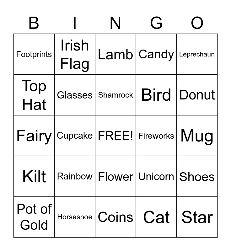 This bingo card has a free space and 24 words: Rainbow, Horseshoe, Shamrock, Pot of Gold, Leprechaun, Footprints, Top Hat, Irish Flag, Fireworks, Flower, Bird, Fairy, Unicorn, Shoes, Glasses, Cat, Mug, Lamb, Donut, Cupcake, Star, Kilt, Candy and Coins.