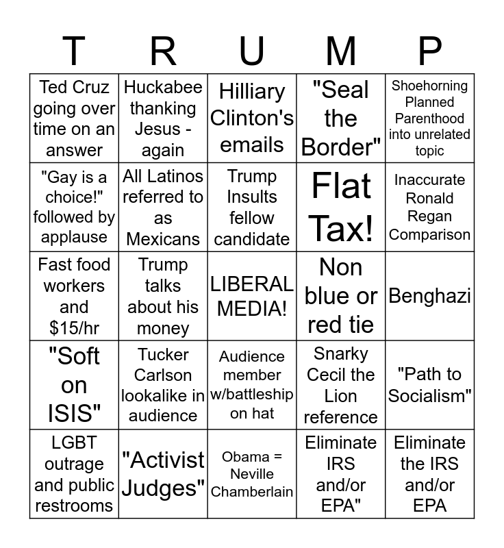 This bingo card has a free space and 24 words: Tucker Carlson lookalike in audience, "Activist Judges", Trump Insults fellow candidate, LGBT outrage and public restrooms, Shoehorning Planned Parenthood into unrelated topic, Ted Cruz going over time on an answer, "Gay is a choice!" followed by applause, Huckabee thanking Jesus - again, Non blue or red tie, Audience member w/battleship on hat, Flat Tax!, Fast food workers and $15/hr, Snarky Cecil the Lion reference, "Path to Socialism", All Latinos referred to as Mexicans, Eliminate IRS and/or EPA", Benghazi, Hilliary Clinton's emails, Inaccurate Ronald Regan Comparison, Trump talks about his money, Eliminate the IRS and/or EPA, "Soft on ISIS", "Seal the Border" and Obama = Neville Chamberlain.