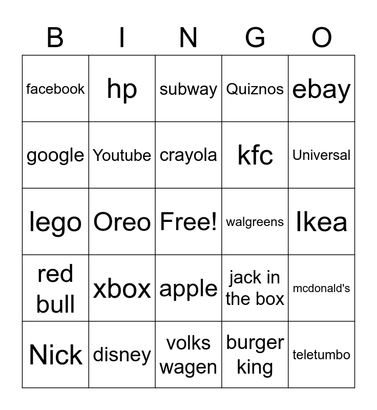 This bingo card has a free space and 26 words: apple, burger king, crayola, disney, ebay, facebook, google, hp, Ikea, jack in the box, kfc, lego, mcdonald's, Nick, Oreo, Pepsi, Quiznos, red bull, subway, teletumbo, Universal, volks wagen, walgreens, xbox, Youtube and zara.