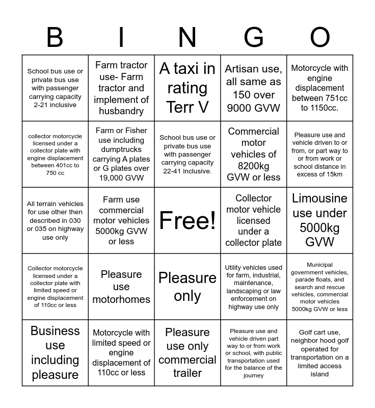 This bingo card has a free space and 29 words: Business use including pleasure, Artisan use-private passenger motor vehicles and commercial motor vehicles, 5000kg GVW or less, Farm use commercial motor vehicles 5000kg GVW or less, Delivery vehicles 5000kg GVW or less also used for pleasure, School bus use or private bus use with passenger carrying capacity 2-21 inclusive, A taxi in rating Terr V, Farm or Fisher use including dumptrucks carrying A plates or G plates over 19,000 GVW, Pleasure use motorhomes, Collector motor vehicle licensed under a collector plate, Motorcycle with limited speed or engine displacement of 110cc or less, Limousine use under 5000kg GVW, Golf cart use, neighbor hood golf operated for transportation on a limited access island, Pleasure use only commercial trailer, Pleasure use and vehicle driven part way to or from work or school, with public transportation used for the balance of the journey, Pleasure use and vehicle driven to or from, or part way to or from work or school distance in excess of 15km, Pleasure use and vehicle driven to or from, or part way to or from, work or school, a one way distance not exceeding 15km, Pleasure only, Collector motorcycle licensed under a collector plate with limited speed or engine displacement of 110cc or less, Motorcycle with engine displacement between 751cc to 1150cc., All terrain vehicles for use other then described in 030 or 035 on highway use only, Utility vehicles used for farm, industrial, maintenance, landscaping or law enforcement on highway use only, Parade use or construction machinery, Commercial motor vehicles of 8200kg GVW or less, collector motorcycle licensed under a collector plate with engine displacement between 401cc to 750 cc, Artisan use, all same as 150 over 9000 GVW, Farm tractor use- Farm tractor and implement of husbandry, Municipal government vehicles, parade floats, and search and rescue vehicles, commercial motor vehicles 5000kg GVW or less, School bus use or private bus use with passenger carrying capacity 22-41 inclusive. and School bus use or private bus use with passenger carrying capacity 42 or over.