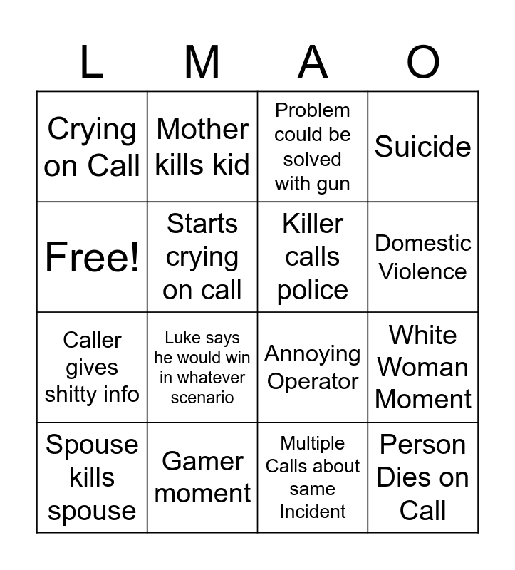This bingo card has 16 words: Gamer moment, White Woman Moment, Problem could be solved with gun, Crying on Call, Caller gives shitty info, Mother kills kid, Annoying Operator, Multiple Calls about same Incident, Free!, Starts crying on call, Spouse kills spouse, Suicide, Luke says he would win in whatever scenario, Domestic Violence, Killer calls police and Person Dies on Call.