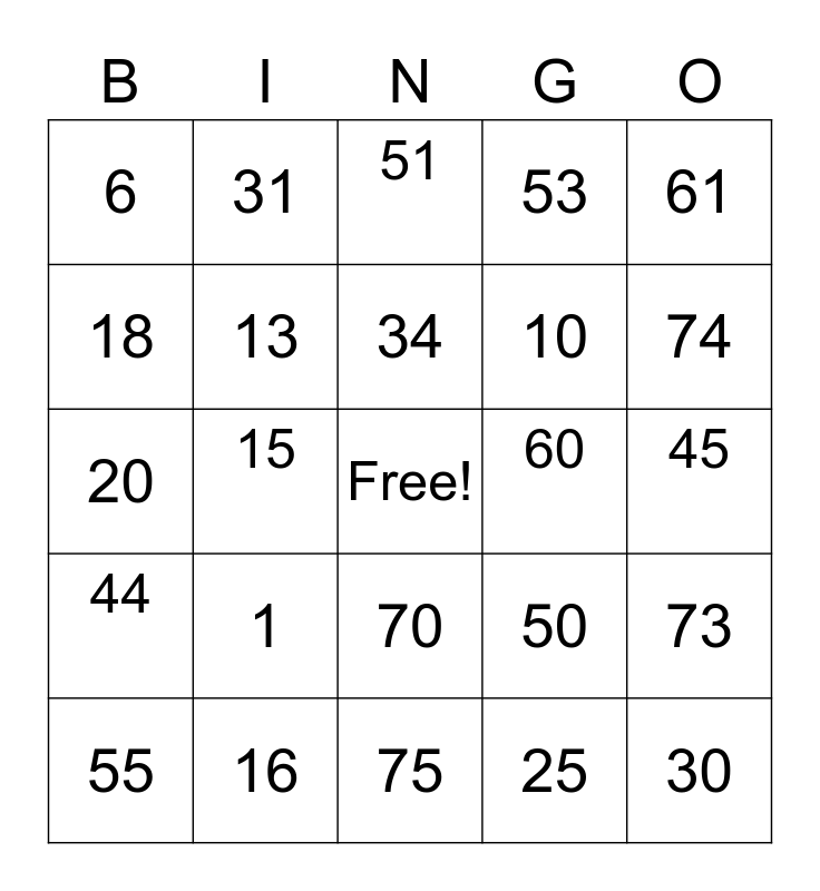 This bingo card has a free space and 24 words: 1, 16, 34, 55, 61, 6, 18, 31, 60, 70, 10, 20, 50, 73, 13, 25, 45, 51, 74, 15, 30, 44, 53 and 75.