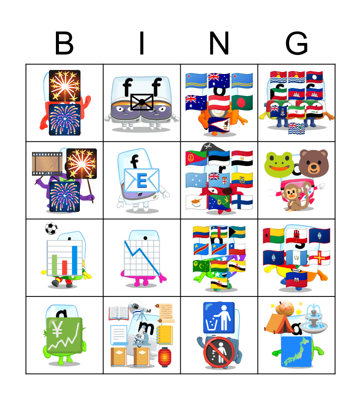 This bingo card has 23 images and 23 words: ⛺⛲🗾, 🦀🐙, 🐸🐻🐒, 🍅🍉🍓🍎🍎🌶🍄, 🎞🎇🎆, 🎇🎆, 📧, ✉, 💹, 📈, 📉, 📊, 📆📍📌📋📅, 🖇🗓🗓📍🖊📋🖊🖋, 📖🔭📜📃🔬📒📔📔🏮, 📺🖲📠🎥📽🎬📞📞🖱🖨, 🇦🇼🇦🇺🇦🇼🇦🇺🇦🇹🇧🇩🇦🇸, 🇨🇴🇨🇫🇧🇸🇨🇩🇨🇩🇨🇱🇨🇨🇧🇴🇧🇳🇧🇳, 🇪🇷🇪🇪🇪🇬🇫🇲🇫🇯🇪🇨🇨🇾🇨🇽🇫🇮, 🇬🇼🇬🇮🇬🇺🇬🇺🇬🇹🇬🇬🇭🇹, 🇰🇮🇰🇮🇱🇦🇰🇼🇰🇭🇰🇭🇰🇾🇮🇷🇮🇶🇮🇴, 🚮🚯 and ♈♌♑♍♐♏♋♉♓⛎♐♎.