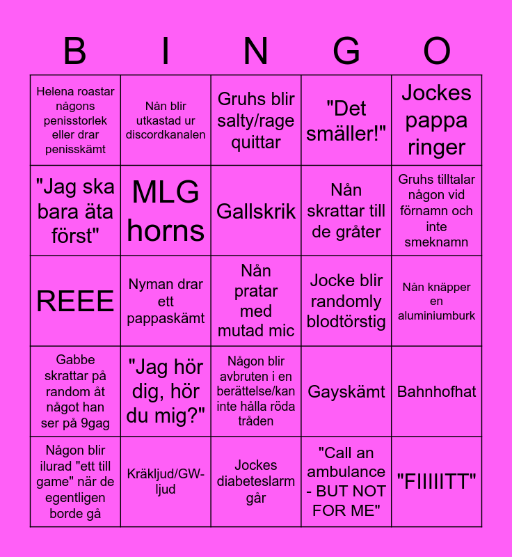 This bingo card has 30 words: Kräkljud/GW-ljud, Gabbe vet totalt värdelös och obskyr fakta, Nyman drar ett pappaskämt, "Jag blir trött bara jag ser dig", Helena roastar någons penisstorlek eller drar penisskämt, Gruhs blir salty/rage quittar, MLG horns, Någon blir avbruten i en berättelse/kan inte hålla röda tråden, Jocke blir randomly blodtörstig, Jockes diabeteslarm går, Nån knäpper en aluminiumburk, Nån pratar med mutad mic, "Call an ambulance - BUT NOT FOR ME", "FIIIIITT", Gruhs tilltalar någon vid förnamn och inte smeknamn, Jocke pratar jobb/måste lägga sig efter Bolibompa, Gayskämt, Gabbe skrattar på random åt något han ser på 9gag, "Jag hör dig, hör du mig?", Jockes pappa ringer, REEE, "Som flickan sa", Nån blir utkastad ur discordkanalen, Nån skrattar till de gråter, "Jag ska bara äta först", "Det smäller!", Bahnhofhat, Någon blir ilurad "ett till game" när de egentligen borde gå, Gallskrik and Nån rapar.