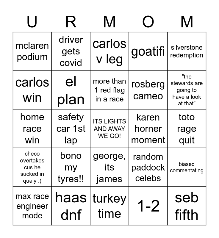 This bingo card has a free space and 24 words: bono my tyres!!, haas dnf, more than 1 red flag in a race, max race engineer mode, silverstone redemption, mclaren podium, carlos win, driver gets covid, karen horner moment, george, its james, rosberg cameo, home race win, random paddock celebs, biased commentating, el plan, 1-2, toto rage quit, carlos v leg, "the stewards are going to have a look at that", safety car 1st lap, seb fifth, checo overtakes cus he sucked in qualy :(, goatifi and turkey time.