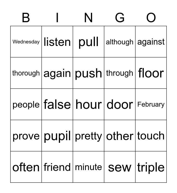 This bingo card has 33 words: triple, among, false, move, prove, again, against, often, listen, put, push, pull, bull, bush, door, floor, friend, people, pupil, other, pretty, laugh, Wednesday, February, minute, hour, although, through, thorough, touch, clothes, sew and because.