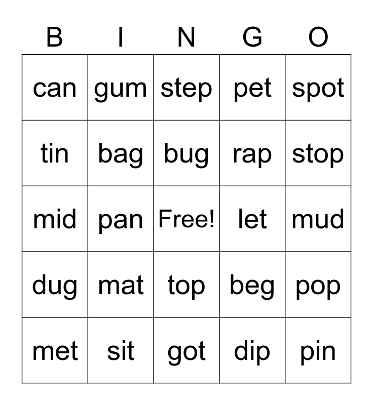 This bingo card has a free space and 24 words: mat, sit, bug, met, spot, can, tin, gum, let, top, rap, mid, beg, pop, bag, dip, mud, step, stop, pan, pin, dug, pet and got.