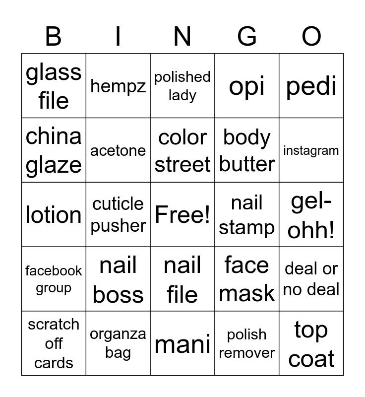 This bingo card has a free space and 43 words: waxing kit, top coat, striping tape, scratch off cards, shea butter, polish remover, polished lady, plns, pedi, organza bag, opi, nail stamp, nail file, nail boss, mystery box, mani, mail day, lotion, loofa, instagram, hempz, healthy hoof, handmade soap, glass file, gift set, gel-ohh!, foot mask, finger clips, face mask, facebook group, earrings, deal or no deal, deal of the day, cuticle pusher, cuticle oil, cuccio, cotton pad, color street, china glaze, body butter, avry, acetone and #supplyfie.