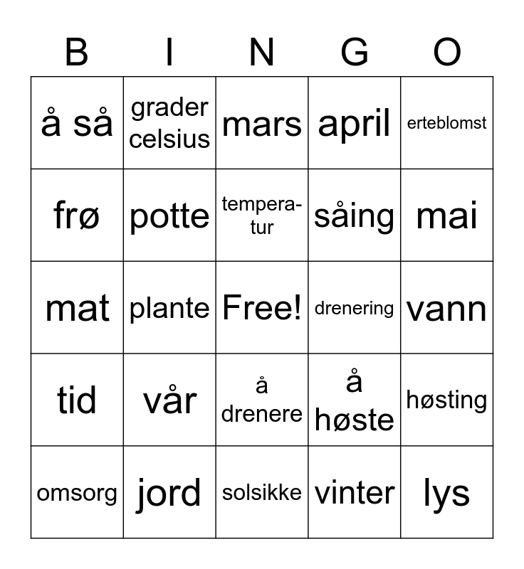 This bingo card has a free space and 24 words: vår, jord, tempera-tur, omsorg, erteblomst, å så, frø, grader celsius, drenering, å drenere, såing, mat, å høste, høsting, potte, vinter, vann, mars, mai, plante, lys, tid, april and solsikke.