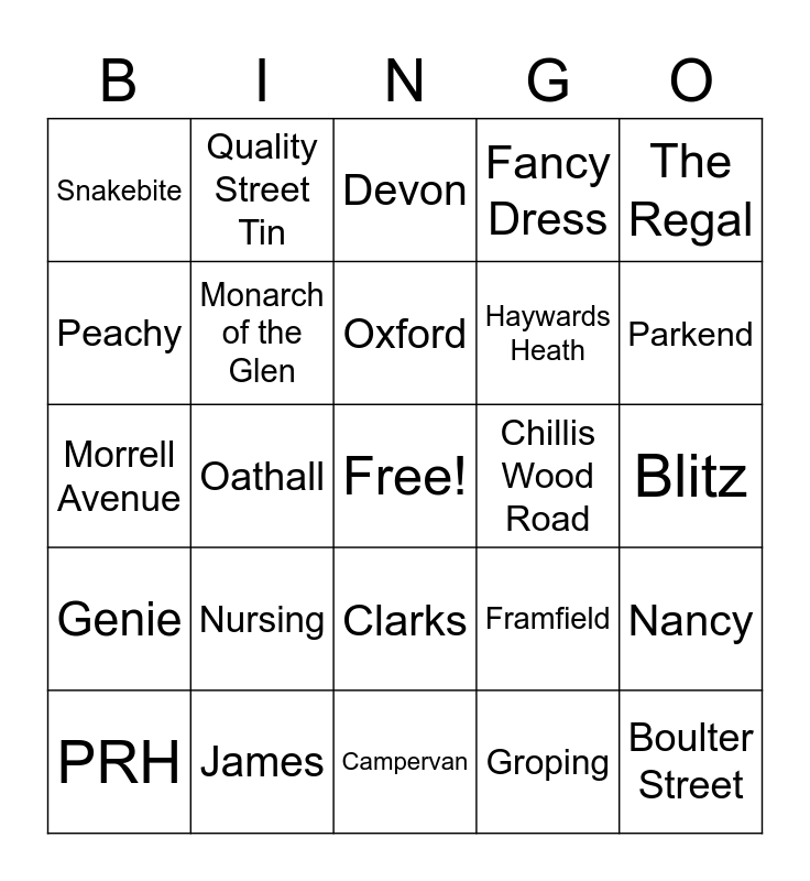 This bingo card has a free space and 24 words: Nursing, James, Oxford, PRH, The Regal, Snakebite, Peachy, Quality Street Tin, Chillis Wood Road, Clarks, Haywards Heath, Morrell Avenue, Framfield, Nancy, Monarch of the Glen, Groping, Blitz, Devon, Parkend, Oathall, Boulter Street, Genie, Fancy Dress and Campervan.