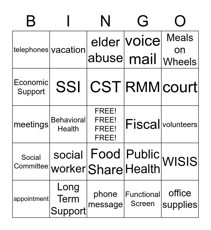 This bingo card has a free space and 33 words: copy machine, job coach, Behavioral Health, InTake, Social Committee, SSI, Meals on Wheels, appointment, vacation, paper jam, CST, elder abuse, case manager, North conference, Fiscal, court, Long Term Support, meetings, social worker, Public Health, Food Share, desk, telephones, volunteers, phone message, office supplies, voice mail, RMM, Economic Support, WISIS, parking lot, Functional Screen and lobby.