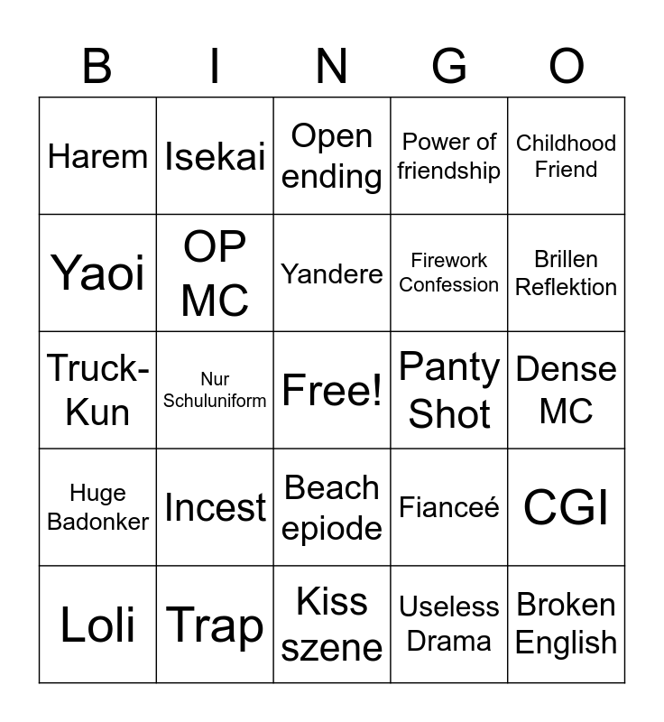 This bingo card has a free space and 24 words: Incest, Trap, Yandere, Loli, Childhood Friend, Harem, Yaoi, Isekai, Panty Shot, Beach epiode, Firework Confession, Truck-Kun, Fianceé, CGI, OP MC, Useless Drama, Dense MC, Open ending, Brillen Reflektion, Nur Schuluniform, Broken English, Huge Badonker, Power of friendship and Kiss szene.