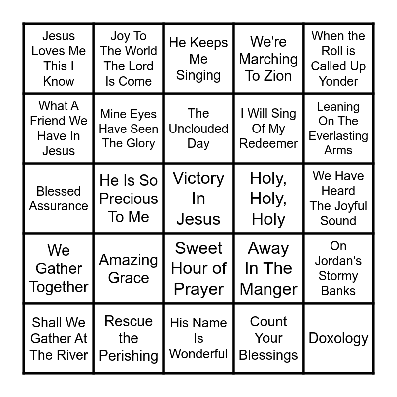 This bingo card has a free space and 24 words: Amazing Grace, Rescue the Perishing, The Unclouded Day, Shall We Gather At The River, When the Roll is Called Up Yonder, Jesus Loves Me This I Know, What A Friend We Have In Jesus, Joy To The World The Lord Is Come, Holy, Holy, Holy, Sweet Hour of Prayer, I Will Sing Of My Redeemer, Blessed Assurance, Away In The Manger, On Jordan's Stormy Banks, Mine Eyes Have Seen The Glory, Count Your Blessings, We Have Heard The Joyful Sound, He Keeps Me Singing, Leaning On The Everlasting Arms, He Is So Precious To Me, Doxology, We Gather Together, We're Marching To Zion and His Name Is Wonderful.