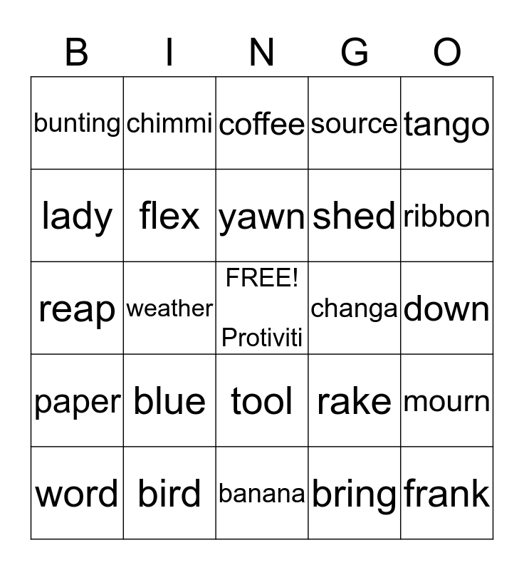 This bingo card has a free space and 24 words: blue, bird, yawn, word, tango, bunting, lady, chimmi, changa, tool, shed, reap, rake, mourn, flex, bring, down, coffee, ribbon, weather, frank, paper, source and banana.
