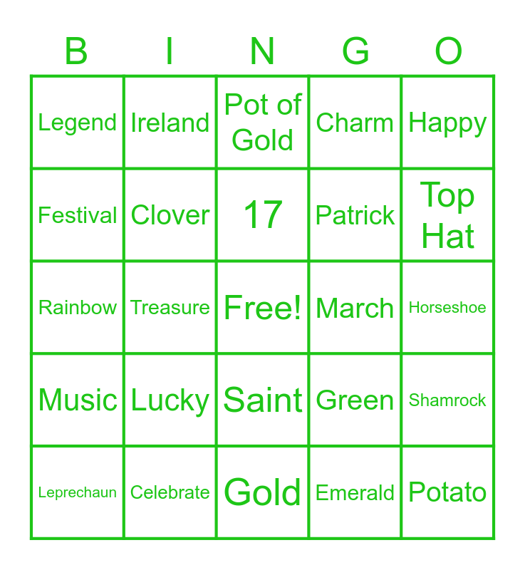 This bingo card has a free space and 25 words: Lucky, Gold, 17, Leprechaun, Happy, Legend, Festival, Ireland, March, Saint, Patrick, Rainbow, Green, Shamrock, Clover, Friends, Horseshoe, Pot of Gold, Top Hat, Treasure, Potato, Celebrate, Music, Charm and Emerald.