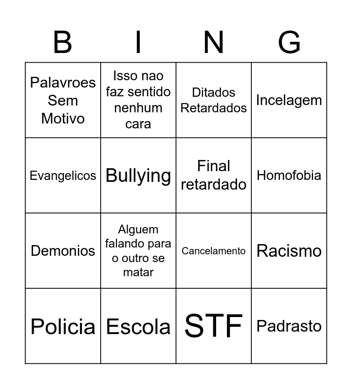 This bingo card has 20 words: Racismo, Jornalismo, Ditados Retardados, Culto Magico, Policia, Evangelicos, Escola, Palavroes Sem Motivo, Demonios, Isso nao faz sentido nenhum cara, Alguem falando para o outro se matar, Cancelamento, Bullying, Padrasto, Final retardado, Abuso Sexual, Homofobia, Incelagem, STF and Suicidio.
